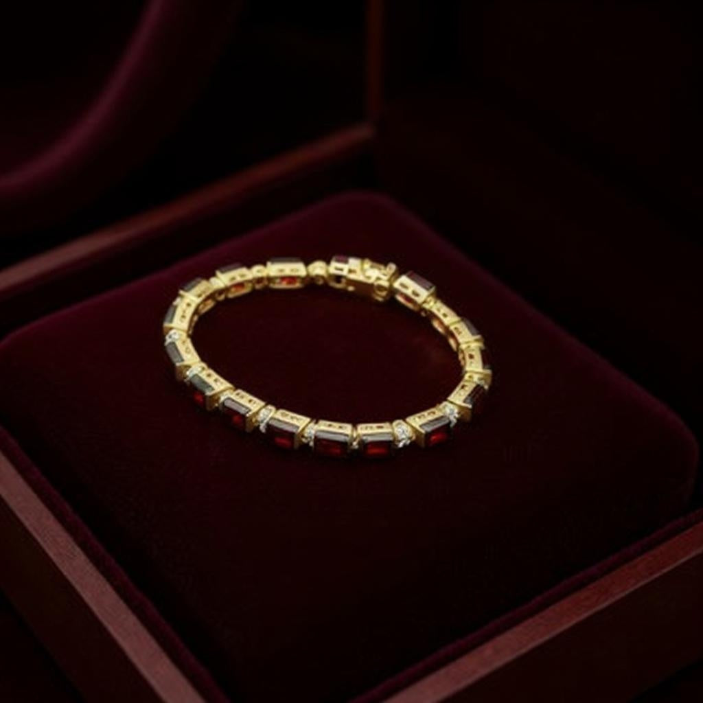 Add a touch of timeless elegance with this 7.4-inch bracelet, crafted from genuine sterling silver and luxuriously layered in 18K yellow gold. The design features rich deep-red garnet gemstones accented by delicate natural diamonds, creating a sophisticated look that shines with every movement.