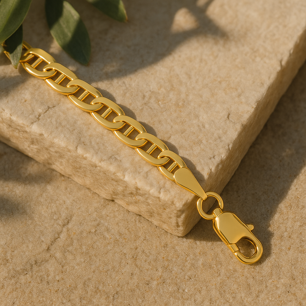 Expertly crafted from 10K solid yellow gold, this Designer Concave Anchor Bracelet exudes strength, style, and sophistication. The classic mariner (anchor) link design features a concave surface that reflects light beautifully, giving it a bold and luxurious finish.